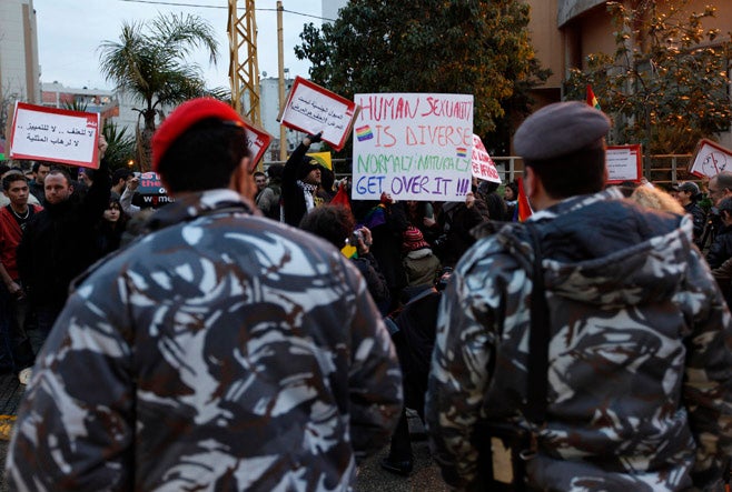 في هذه الصورة المأخوذة بتاريخ 22 فبراير/شباط 2009، تقف الشرطة اللبنانية في حراسة متظاهرين يحملون لافتات أثناء اعتصام للمثليين والمثليات في بيروت. في فبراير/شباط، نظّم أكثر من عشرين مثلياً ومثلية اعتصاماً نادراً ما يتكرر، لدى تقاطع سوديكو المهم في بيروت، احتجاجاً على ما وُصف بأنه واقعة ضرب رجلين مثليين على يد رجلي شرطة بثياب مدنية. أنكر رجال الشرطة تعرض الرجلين للضرب على يد الشرطة.