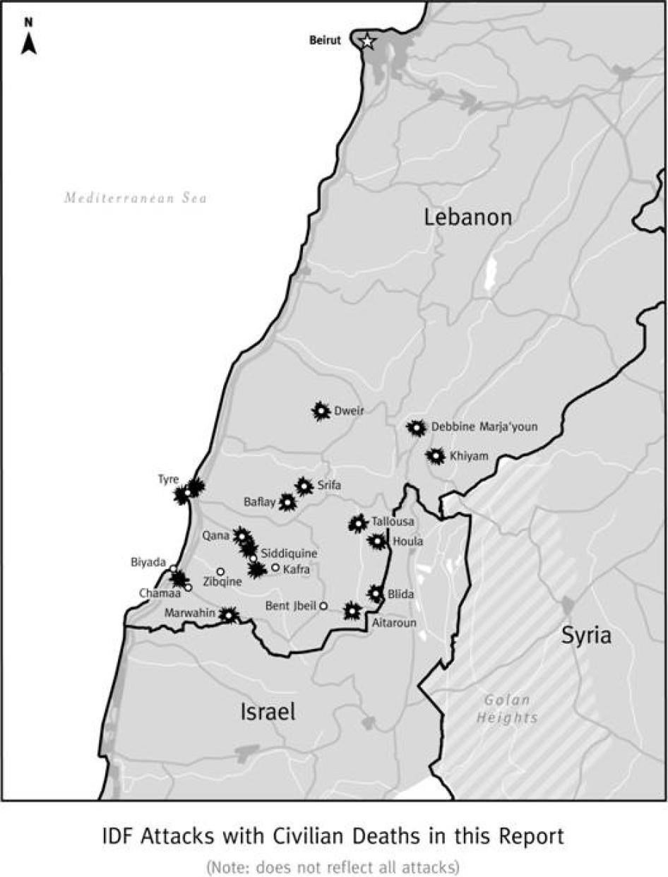 لا تؤكد هيومن رايتس ووتش أن جميع الغارات الإسرائيلية استهدفت مدنيين، فهناك الكثير من الغارات التي هاجمت فيها القوات الإسرائيلية أهدافاً عسكرية مشروعة، مثل منصات إطلاق صواريخ ومواقع عسكرية تحت الأرض. لكن، وفي الحالات الموثقة أدناه، لم يكن ثمة أثر لهدف عسكري في المنازل التي استهدفها الجيش الإسرائيلي. لقد أعطى القرويون الذين تمت مقابلتهم سراً وبوجود السائل والمجيب فقط شهادات منسجمة ذات مصداقية تؤكد أن حزب الله لم يكن له وجود في منازلهم أو في جوارها حين وقعت الغارات، ولم نجد أي دليل يوحي بخلاف ذلك.