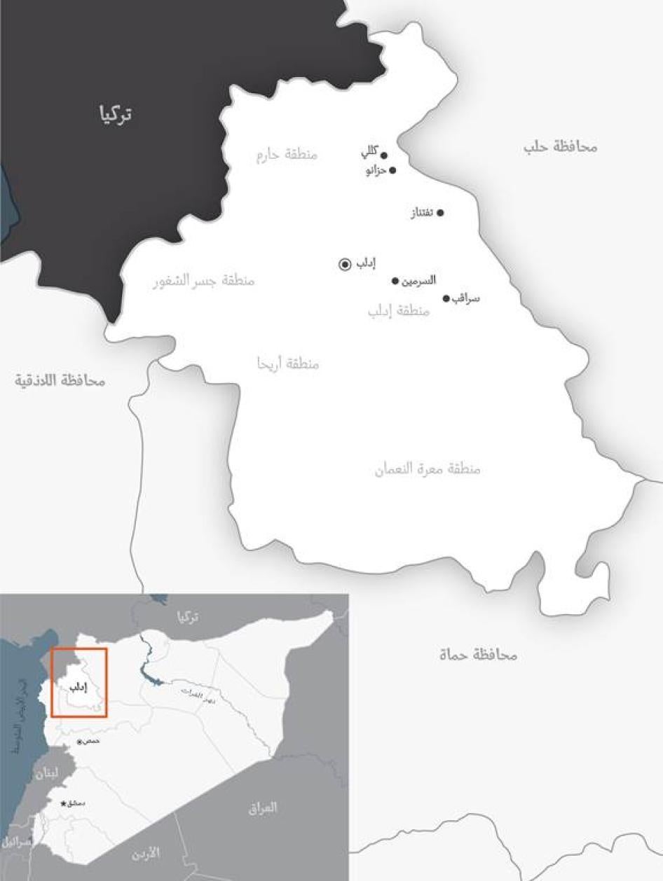وزارت هيومن رايتس ووتش بلدات ال سرمين وسراقب وتفتناز وحزانو وكللي في الفترة الممتدة من 25 إلى 29 أبريل/نيسان، وقابلت 65 ضحية وشاهدًا على الهجمات. كما قامت هيومن رايتس ووتش، خلال نفس الزيارة، بفحص أدلة مادية من قبيل المباني المدمرة والمحروقة، وبقايا الذخيرة المستعملة، وآثار الرصاص والقذائف.