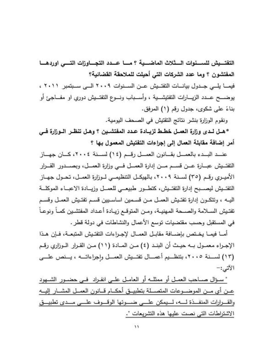 [172] رسالة من وزارة العمل القطرية، 1 نوفمبر/تشرين الثاني 2011، ص 11.
