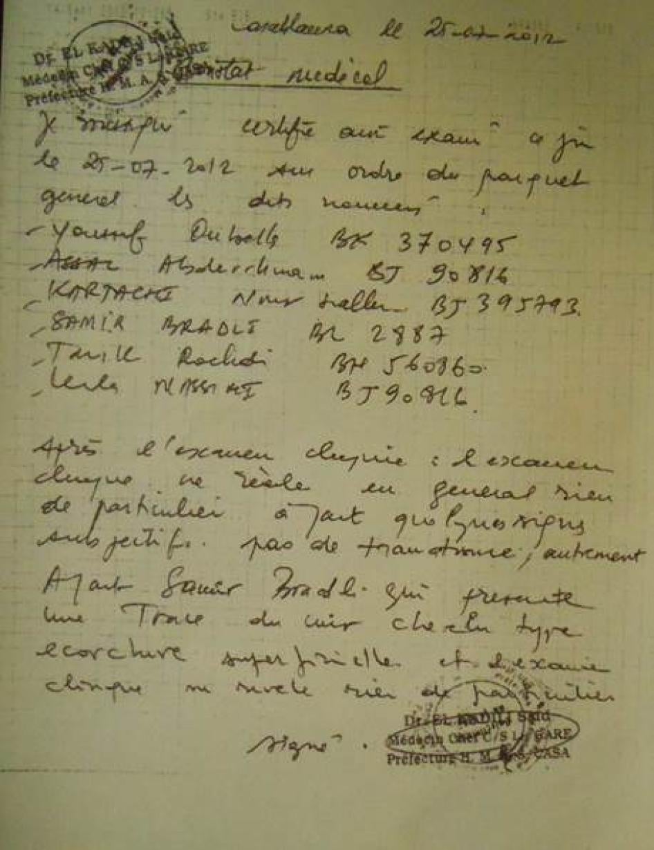 [114] فرع السويد للجنة الحقوقيين الدوليين، " تقرير مراقبة المحاكمة، من جلسات المحكمة الابتدائية، عين السيبة الدار البيضاء، المغرب، ضد إبراهيم دحان وعلي سالم تامك وأحمد الناصري، والدكجة لشكر، ويحظيه الترروزي، وصالح لبيهي، ورشيد الصغير"، 7 فبراير/شباط 2011، http://www.icj-sweden.org/Trial%20observation%20Group%20of%207,%202011,%20final%20version.pdf (تمت زيارته في 7 أغسطس/آب 2012).