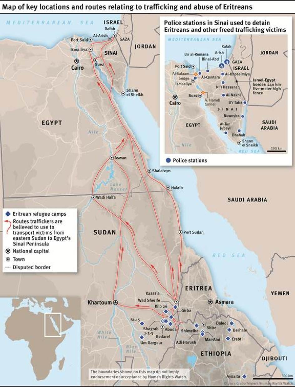 منذ عام 2006 فرّ عشرات الآلاف من الإريتريين من انتهاكات حقوق الإنسان الكثيرة وحالة الفقر المدقع في بلدهم، لينتهي بهم المطاف في شبه جزيرة سيناء بمصر. حتى عام 2010 كانوا يمرون عبر سيناء في العادة طوعاً ودون مشاكل، ثم يعبرون إلى إسرائيل. لكن على مدار السنوات الثلاث الأخيرة، تزايد تحوّل سيناء إلى طريق غير نافذ، يتعرضون فيها للأسر والقسوة والتعذيب والموت.