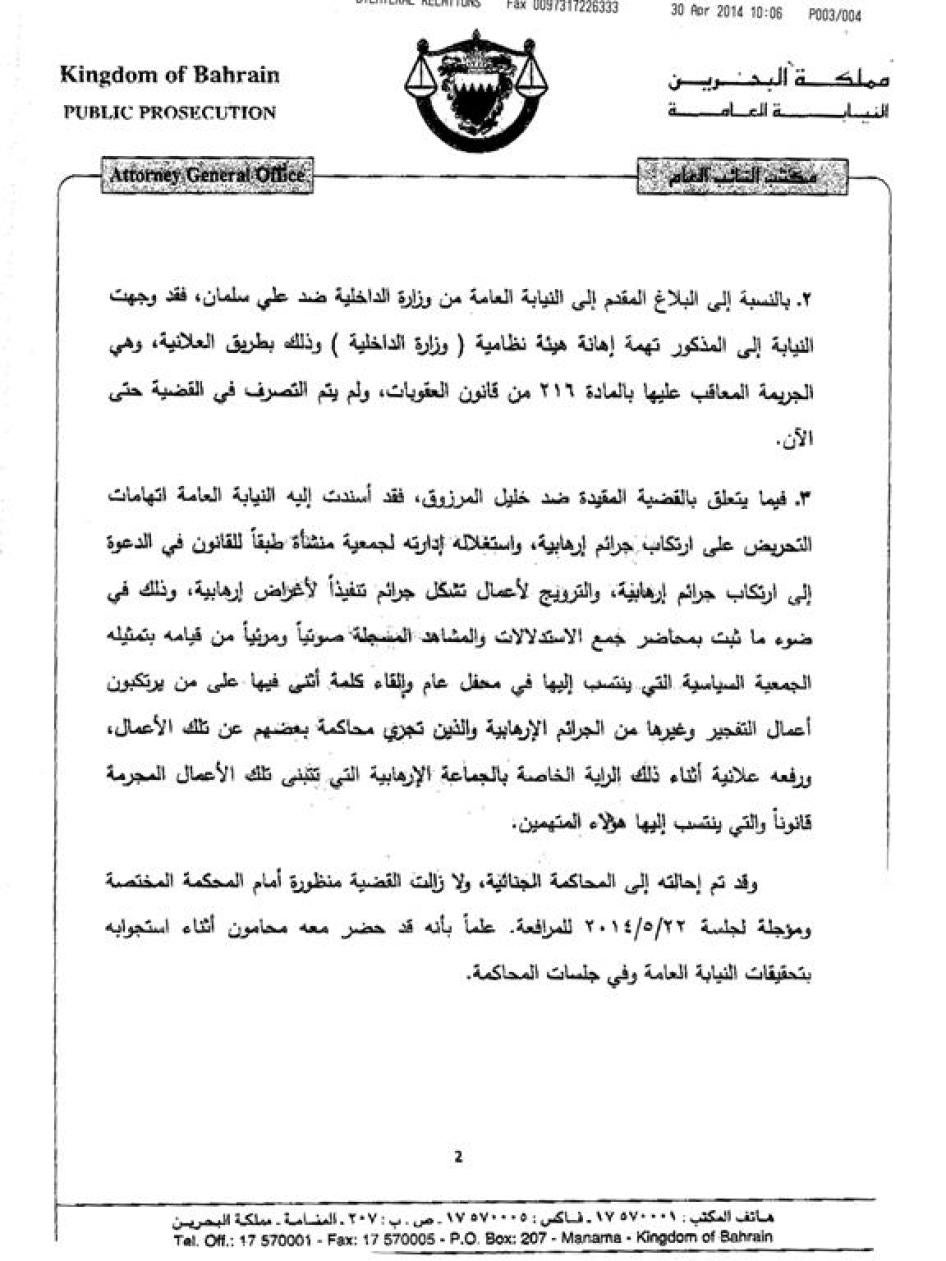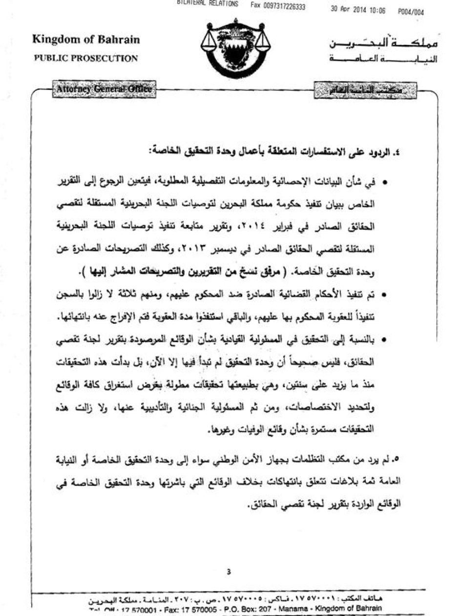 مُلحق بالتقرير كل من رسالة هيومن رايتس ووتش إلى د. علي فضل البوعينين، النائب العام البحريني، ورد مكتب النائب العام على الرسالة.