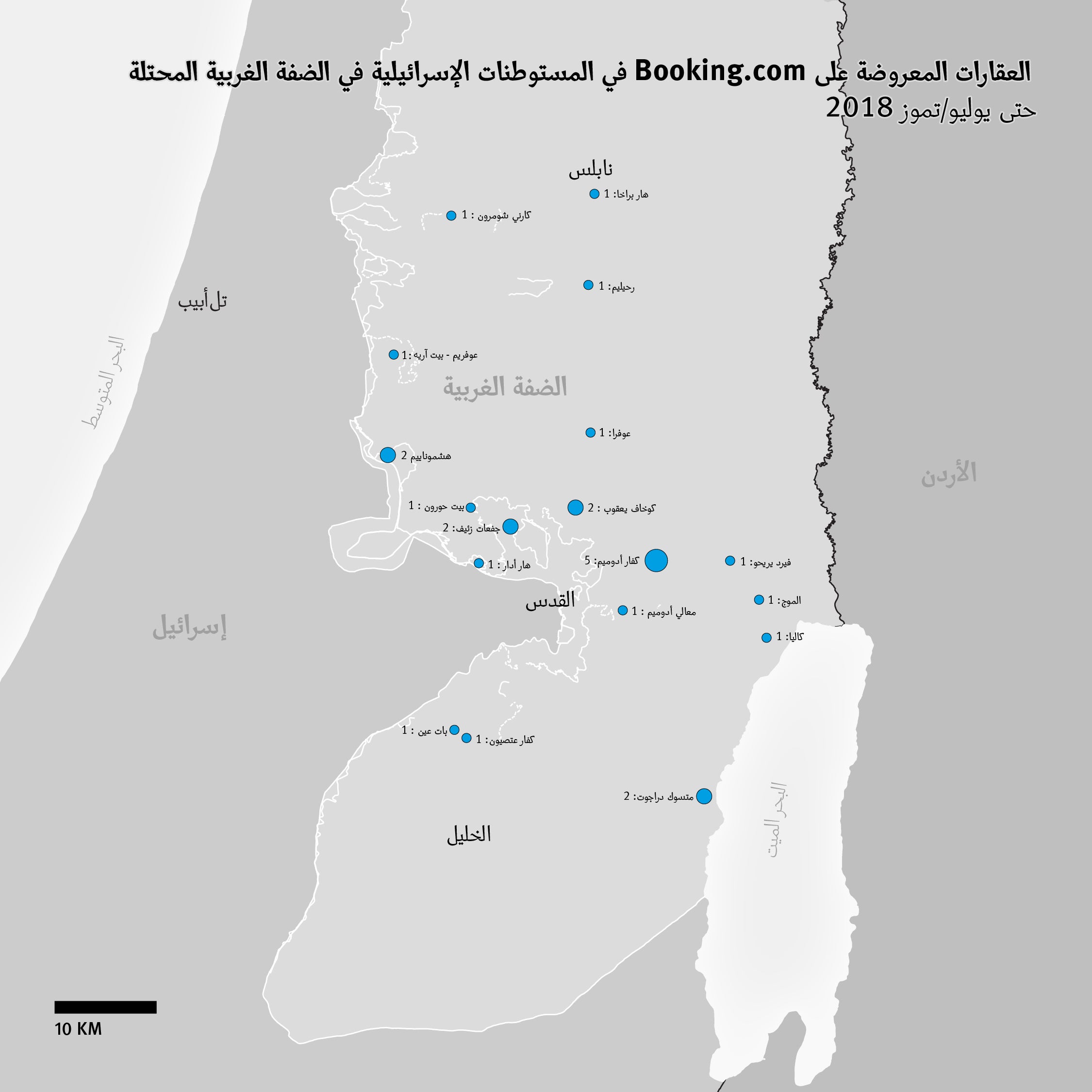حتى 25 يوليو/تموز 2018، كانت أغلب العقارات الموجودة على Booking.com – 15 من 26 – معروضة بشكل خاطئ على أنها داخل إسرائيل. على سبيل المثال، هناك عقار في مستوطنة كوخاف يعقوب معروض على أنه في "كوخاف يعقوب، القدس، 90622، إسرائيل"،[48] والحقيقة أن كوخاف يعقوب ليست في القدس وليست داخل إسرائيل أصلا. كما يوجد عقار يقع في مستوطنة كفار عتصيون بالضفة الغربية، لكنه معروض على أنه في كفار عتصيون، 9091200، إسرائيل.[49] في بعض الحالات، يتم ذكر الشارع بشكل دقيق داخل المستوطنة، لكن تُذكر المستوطنة على أنها داخل إسرائيل. وفي حالات أخرى، يتم ذكر الشارع بشكل غير دقيق على أنه داخل احدى البلدات الفلسطينية، ويتم ذكر البلدة الفلسطينية بشكل غير دقيق أيضا على أنها داخل إسرائيل. في 9 عروض، تم ذكر العقارات بدقة على أنها تقع داخل "مستوطنة إسرائيلية".