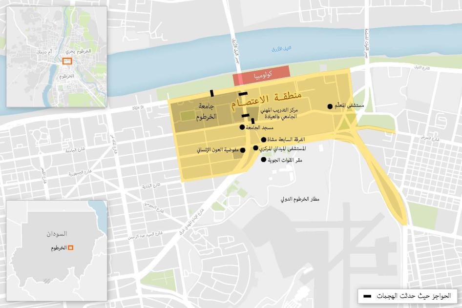بعد ليلة ماطرة وفي ساعات الفجر الأولى المظلمة يوم 3 يونيو/حزيران، في آخر يوم من شهر رمضان، تحرك موكب كبير من المركبات والشاحنات التي أقلت قوات الأمن عبر شوارع الخرطوم والخرطوم بحري، وهي المدينة المجاورة إلى الشمال، حتى وصل الموكب إلى أطراف منطقة الاعتصام قرب القيادة العامة للقوات المسلحة في شارع النيل.[57] فيما بعد، قال المتظاهرون في شارع النيل لـ هيومن رايتس ووتش إنهم رأوا القوات تقترب من جامعة الخرطوم القريبة منهم وبدأوا في الهتاف "سلمية سلمية". مع الإحساس بالخطر، بدأ الأطباء والمسعفون المتطوعون بالاعتصام التحضير للأسوأ.[58] وصف الشهود القوات المقتربة بأنها تضم مسلحين في ثياب الشرطة، والزي الرسمي لقوات الدعم السريع، مع ارتداء بعضهم لزي أسود غير محدد.