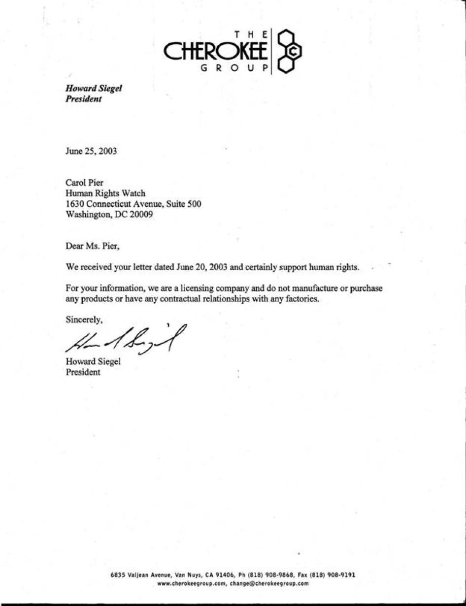 [429] Carta de Howard Siegel, presidente, The Cherokee Group, dirigida a Human Rights Watch, 25 de junio de 2003.