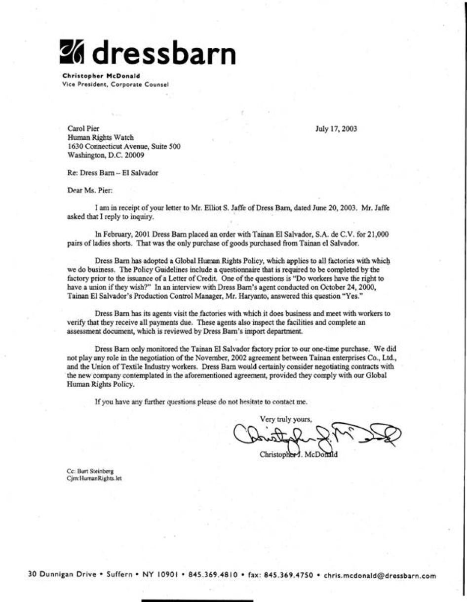 [427] Carta de Christopher J. McDonald, vicepresidente y abogado corporativo, Dress Barn, Inc., dirigida a Human Rights Watch, 17 de julio de 2003.