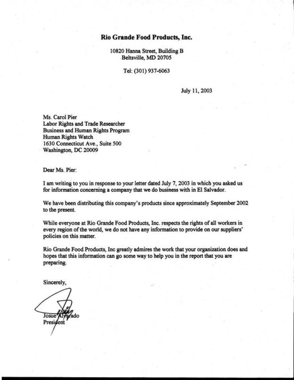 [410] Carta de Josué Alvarado, presidente, Rio Grande Food Products, Inc., dirigida a Human Rights Watch, 11 de julio de 2003.