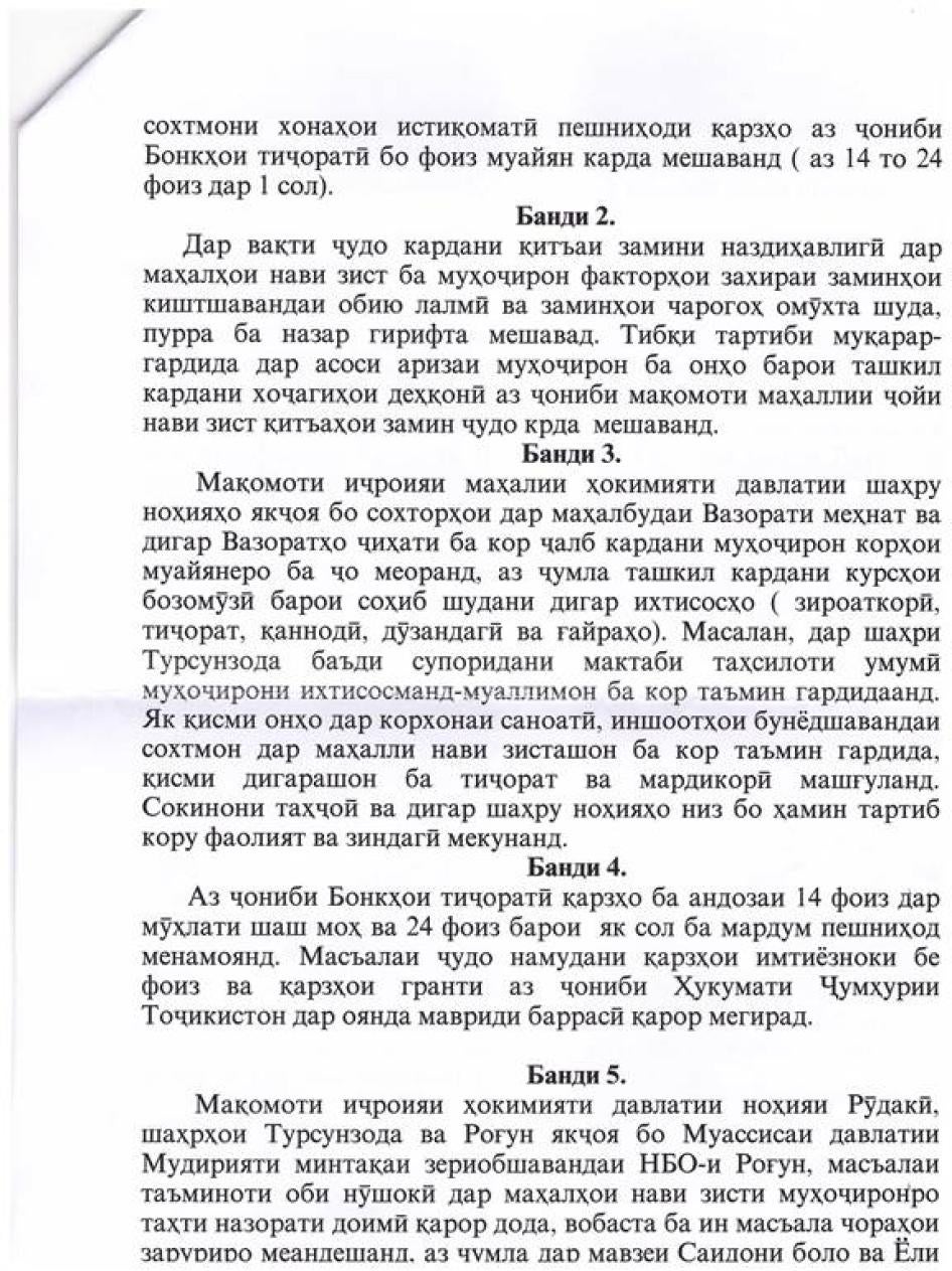 Мудирияти минтақаи зериобшавандаи НБО "Роғун" ваъда дод, ки замини муносибро барои кишоварзӣ ва чарогоҳ дастрас хоҳад кард, ба сохтани мактабҳо афзалият мегузорад ва оби ошомиданӣ, об барои истифодаи рӯзгордорӣ ва об барои обёриро дар ин маконҳои ҳанӯз сокиннашуда кафолат медиҳад.[45]