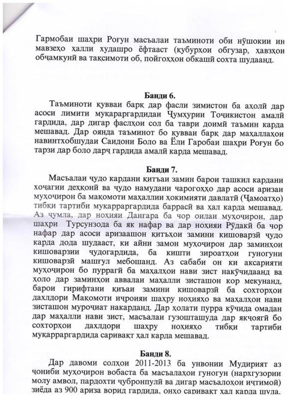 [205] Мусоҳибаи Созмони Дидбони ҳуқуқи башар бо Рамазон Мирзоев - директори муассисаи давлатии Мудирияти минтақаи зериобшавандаи НБО "Роғун", 24 ноябри соли 2013.