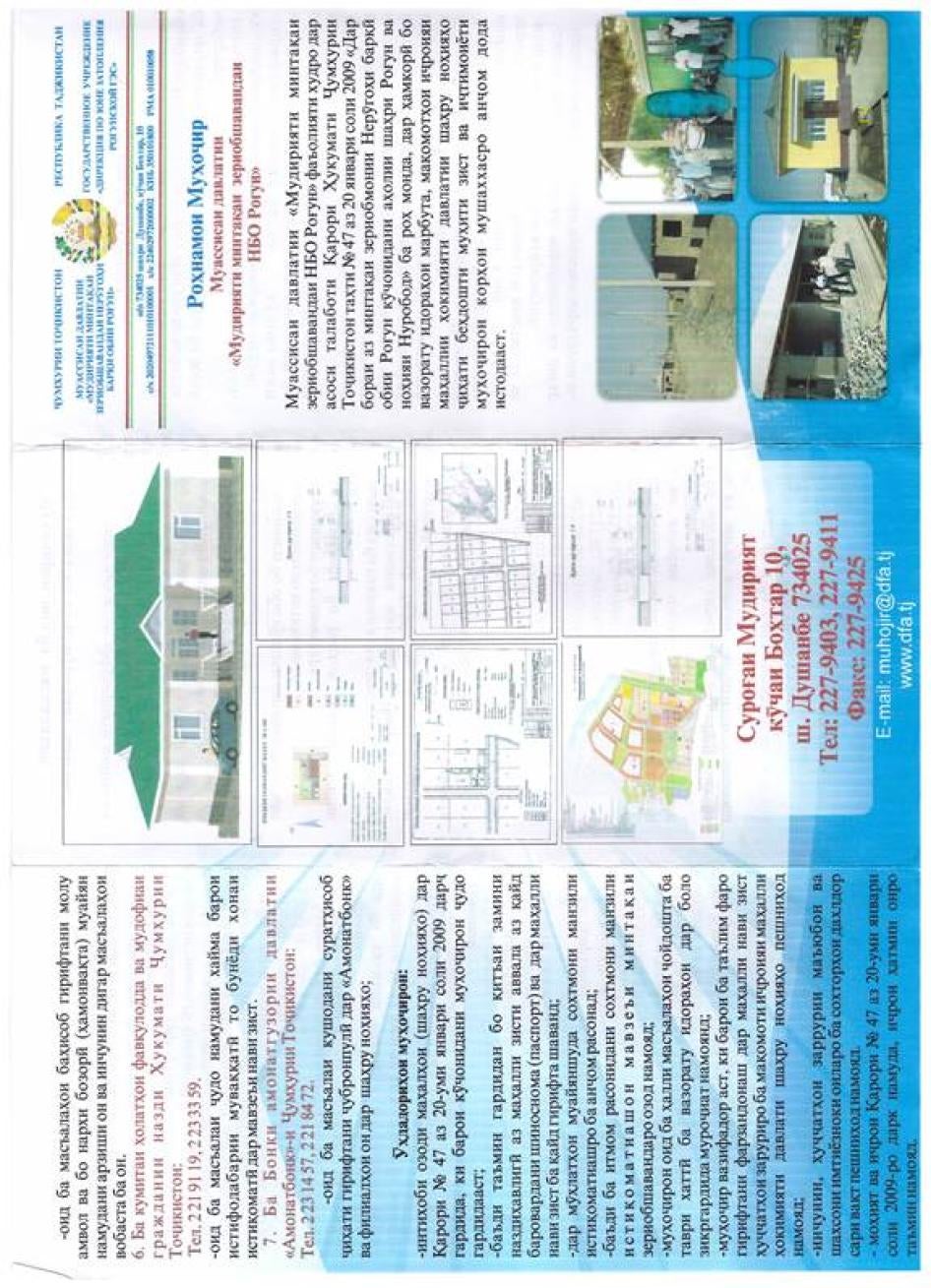 [239] Аввал шахс бояд барои мақоми маҳаллӣ дар макони нав ариза пешниҳод намояд ва ин мақом ба салоҳияти худ аризаро тасдиқ ё инкор мекунад. Пас аз дарёфти ариза мақомоти маҳаллӣ аризаро ба кумитаи давлатии заминсозӣ барои баррасӣ ва ҷудо кардани қитъаи замин ирсол мекунанд. Нигаред: USAID, Country Profile, Property Rights and Resource Governance: Tajikistan, http://usaidlandtenure.net/sites/default/files/country-profiles/full-reports/USAID_Land_Tenure_Tajikistan_Profile.pdf (дастрасӣ дар 14 апресли соли 2014), pp. 7-8.
