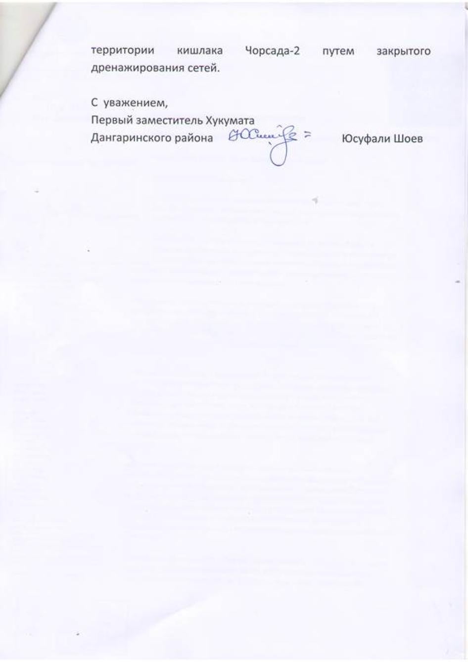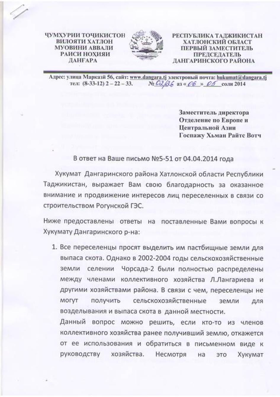 [241] Мактуб аз Юсуфалӣ Шоев, муовини аввали раиси ноҳияи Данғара ба Созмони Дидбони ҳуқуқи башар, 6 майи соли 2014.