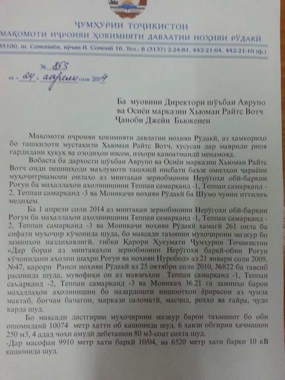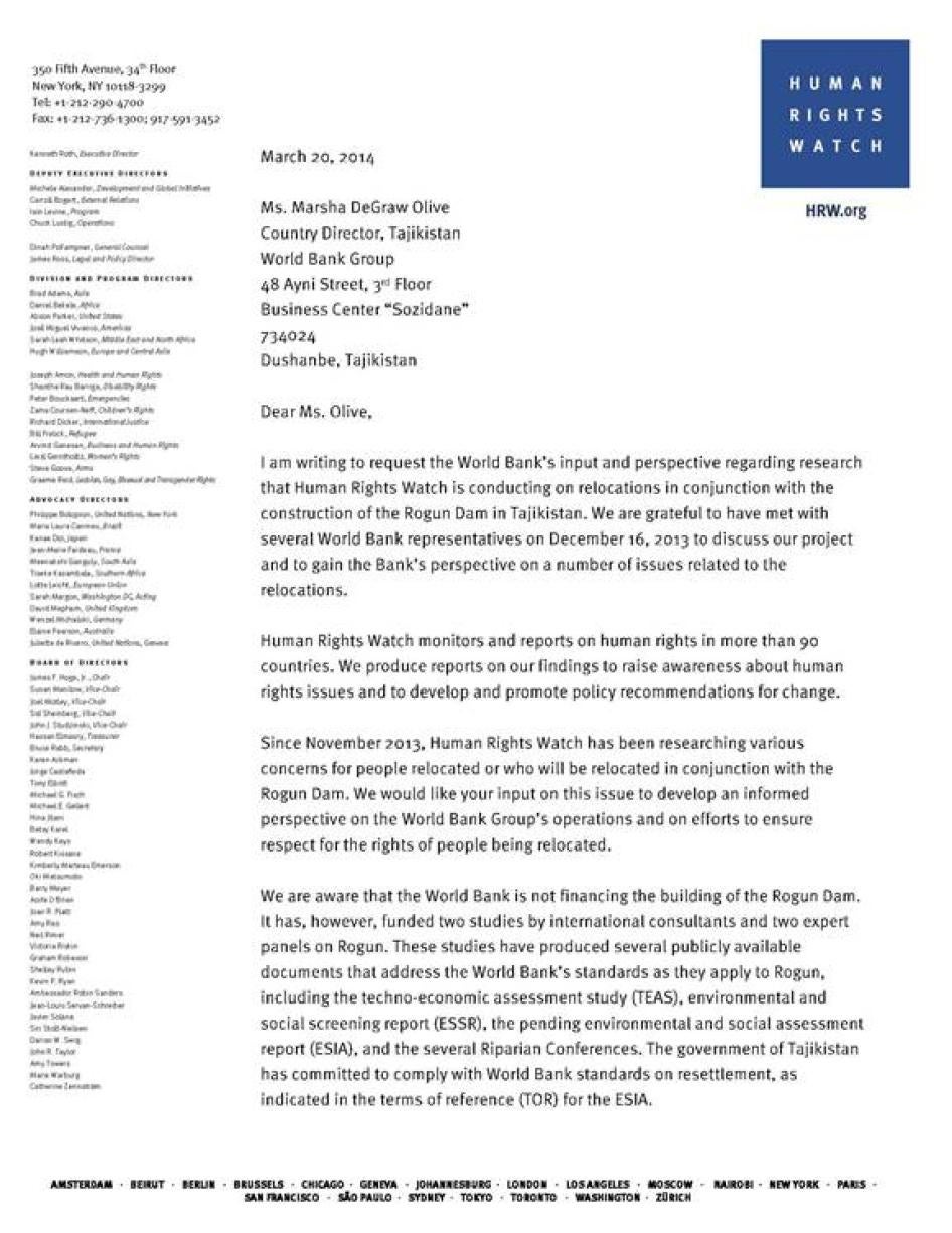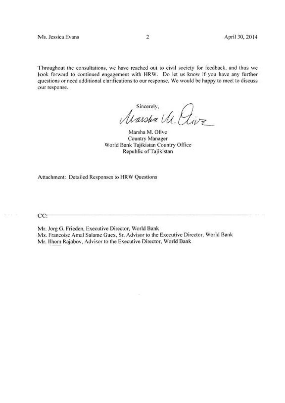 [253] Мактуб аз Марша Олив, менеҷери кишварии идораи Бонки ҷаҳонӣ дар Тоҷикистон ба Созмони Дидбони ҳуқуқи башар, 30 апрели соли 2014.