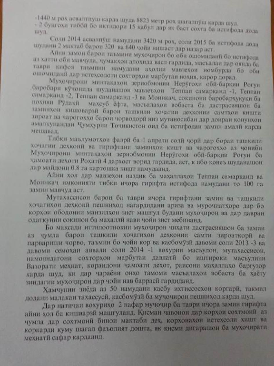 [252] Мусоҳибаи Созмони Дидбони ҳуқуқи башар бо Монӣ Р., деҳаи Тойчӣ, 17 ноябри соли 2014. Ба ҳамин монанд, Паймон Ҷ., ки дар ин охирҳо ба ноҳияи Турсунзода кӯчонида шудааст, ба Созмони Дидбони ҳуқуқи башар гуфт: "Ҳеҷ кас аз мо намепурсад, ки мо чӣ хел зиндагӣ мекунем, ба чӣ ниёз дорем." Мусоҳибаи Созмони Дидбони ҳуқуқи башар бо Паймон Ҷ., деҳаи Тойчӣ, 11 ноябри соли 2013.