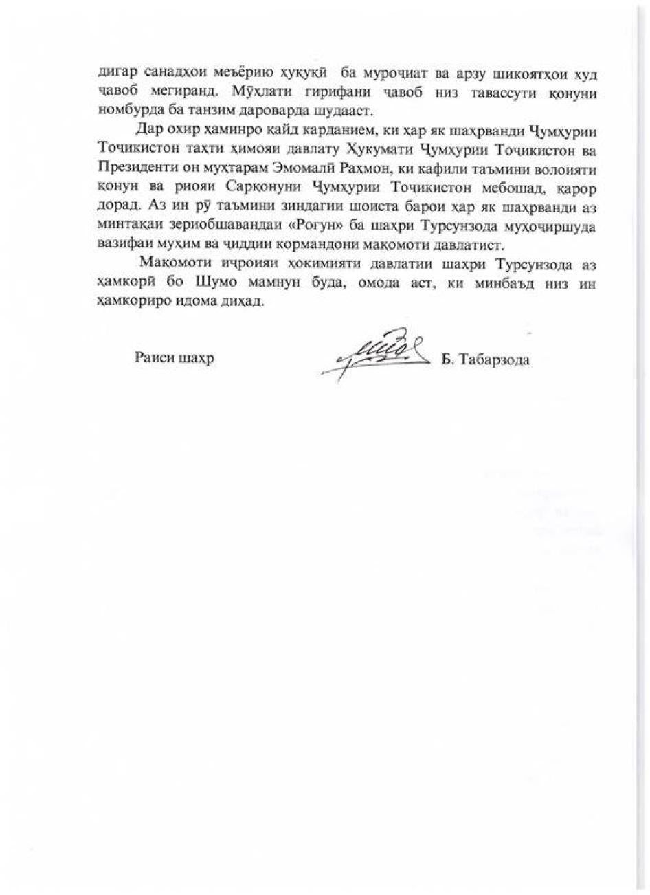 [250] Мактуб аз Самӣ Шариф - директори Муассисаи давлатии Мудирияти минтақаи зериобшавандаи НБО "Роғун", 11 апрели соли 2014, параграфи 8.