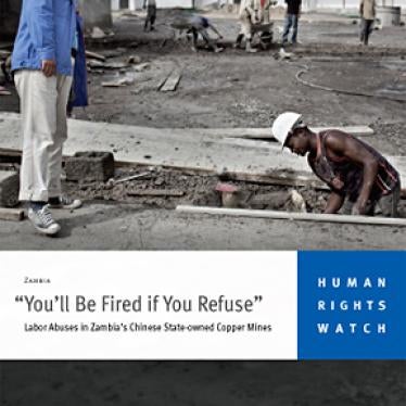 En novembre 2011, Human Rights Watch a publié un rapport décrivant les violations des droits du travail dans quatre filiales zambiennes de la China Non-Ferrous Metal Mining Corporation (CNMC), une entreprise publique relevant de l’organe exécutif suprême de la Chine, le Conseil d’État. Dans le cadre de son étude de suivi réalisée en octobre 2012, Human Rights Watch a constaté d’une part que les filiales de la CNMC avaient opéré des progrès notables sur le plan de la réduction des heures de travail et du respect de la liberté d’association, mais que d’autre part les mineurs continuaient d’être confrontés à de piètres conditions de santé et de sécurité ainsi qu’à des menaces de la part de la direction s’ils cherchaient à faire valoir leurs droits. Le gouvernement zambien n’est pas intervenu comme il conviendrait de le faire pour pallier ces problèmes, a noté Human Rights Watch.