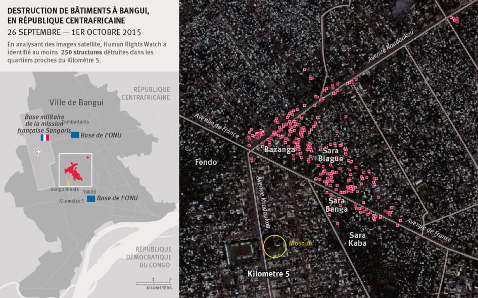 En analysant des images satellite enregistrées avant et après les violences le 22 septembre et le 4 octobre, Human Rights Watch a identifié au moins 250 bâtiments résidentiels et commerciaux détruits dans les quartiers proches du Kilomètre 5, dont deux églises et une mosquée. Les dégats constatés correspondaient aux effets d'incendies et de pillages de toitures. Du fait que les dommages causés par le feu peuvent se circonscrire à l'intérieur de bâtiments et être cachés par des arbres voisins, il est possible que de nombreux autres édifices aient été endommagés.