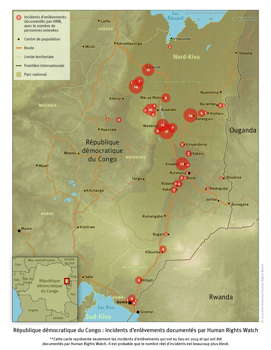Human Rights Watch a confirmé les enlèvements contre rançon de 172 Congolais et de trois ressortissants étrangers lors de 35 incidents distincts dans le Rutshuru, deux dans le territoire du Nyirangongo, un dans le Walikale, et quatre à Goma en 2015. Le nombre actuel des cas est probablement beaucoup plus élevé. Human Rights Watch a également recueilli des informations au sujet de cas de kidnappings dans la ville de Butembo et dans le territoire de Beni, mais ces incidents sont au-delà de la portée de des recherches décrites ici.