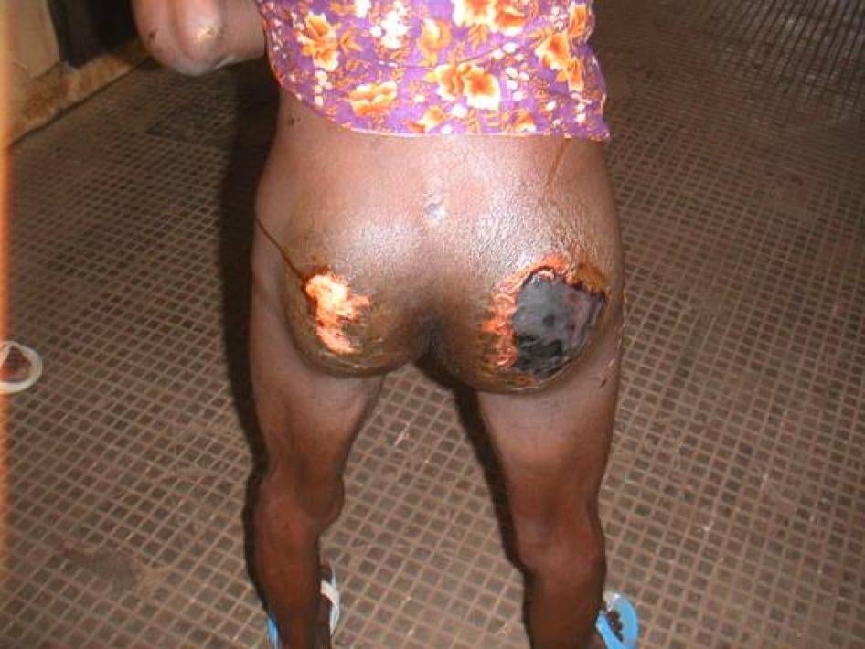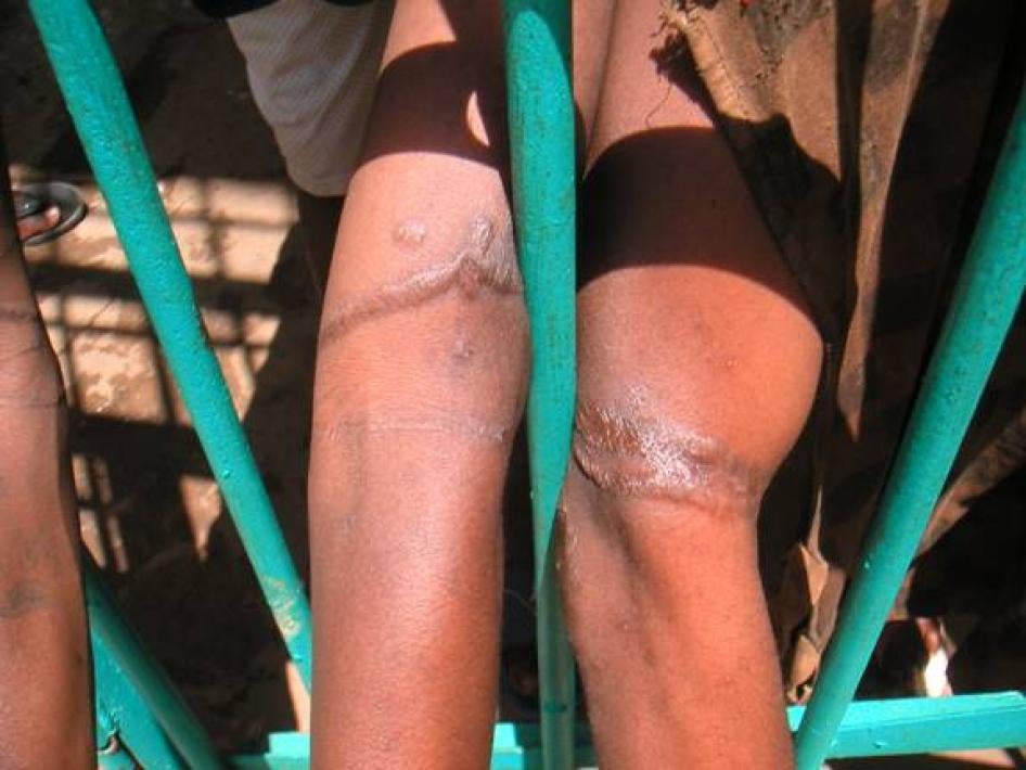 Des prisonniers incarcérés à la Maison Centrale de Conakry présentent des cicatrices provoquées, selon eux, par la méthode de torture utilisée lors des interrogatoires de police, consistant à les attacher au moyen de cordes et à les suspendre en l'air. © 2006 Human Rights Watch