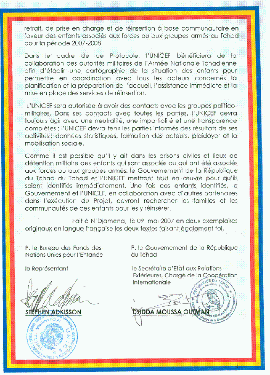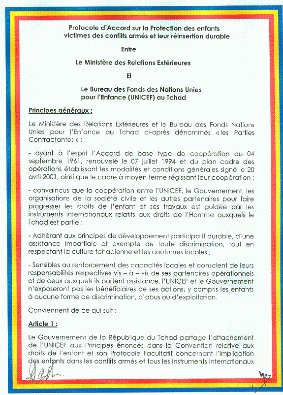 [115] Protocole facultatif à la Convention relative aux droits de l'enfant sur l'implication d'enfants dans un conflit armé adopté le 25 mai 2000, G.A. Res. 54/263, Annex I, 54 U.N. GAOR Supp. (No. 49) at 7, U.N. Doc. A/54/49, Vol. III (2000), entré en force le 12 février 2002, ratifié par le Tchad le 28 août 2002.