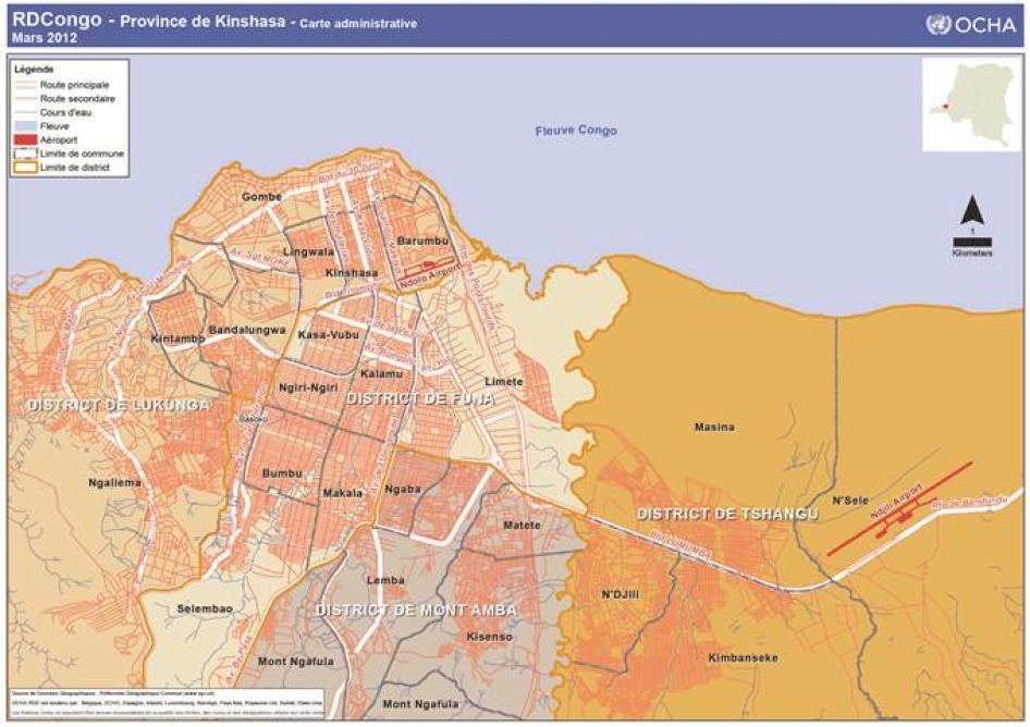 Les exécutions extrajudiciaires et les disparitions forcées ont eu lieu dans plusieurs communes [25] de Kinshasa. La majorité des incidents documentés par Human Rights Watch ont eu lieu dans le district de Funa à Kinshasa (communes de Kasa-Vubu, Kalamu, Bandalungwa, Ngiri-Ngiri, Selembao, Bumbu et Makala) et le district de Mont-Amba (communes de Ngaba, Matete, Limete et Lemba). D’autres cas se sont produits dans le district de Tshangu (communes de Kimbanseke, Ndjili et Masina) et dans le district de Lukunga (communes de Kinshasa, Kintambo, Mont-Ngafula et Ngaliema). [26]