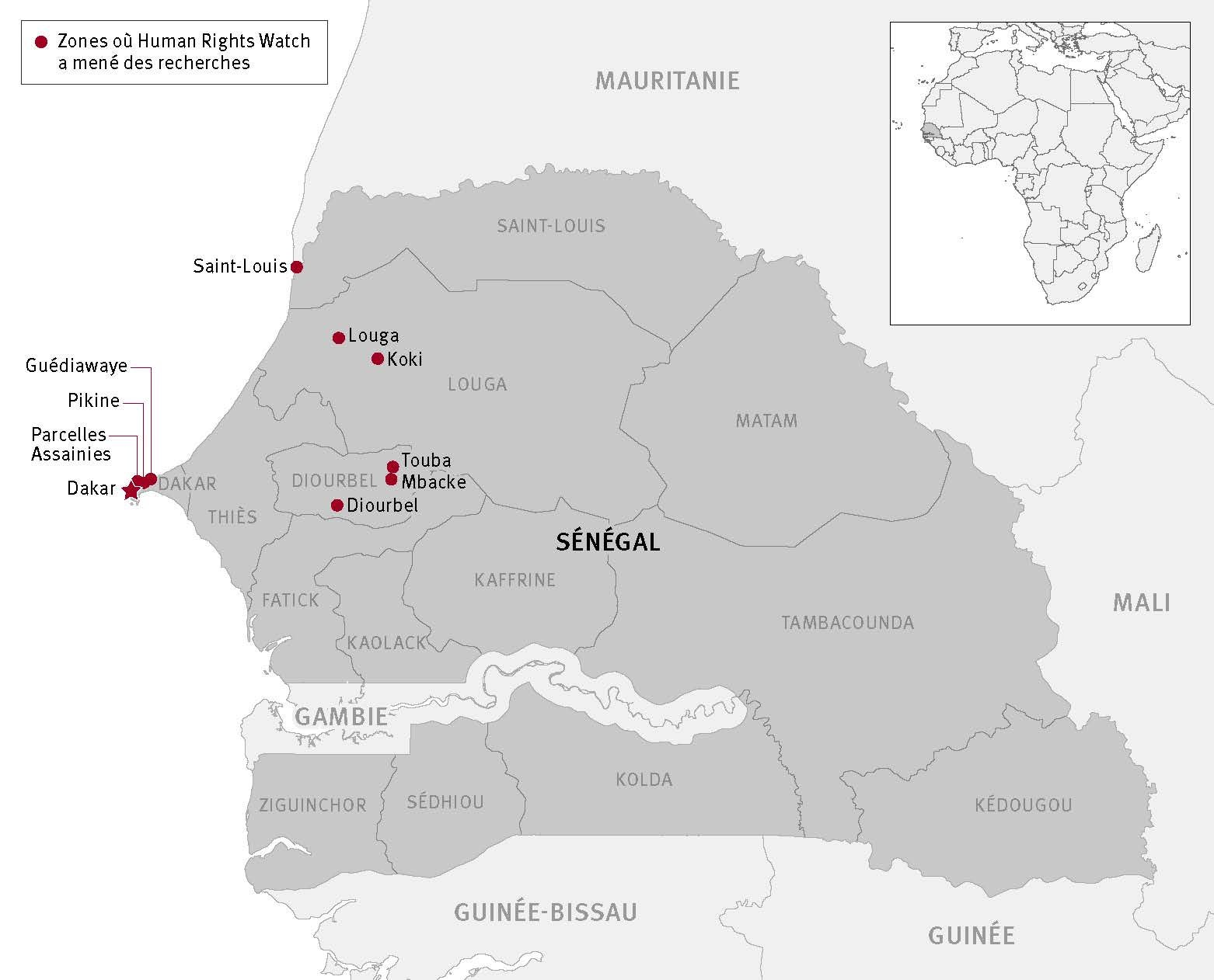 Le présent rapport document des dizaines d’abus graves perpétrés à l’encontre d’enfants talibés par des maîtres coraniques ou leurs assistants en 2017 et 2018, notamment des cas de morts d’enfants, de passages à tabac, d’abus sexuels, de talibés enchaînés ou emprisonnés, et de nombreuses formes d’actes de négligence et de mise en danger. Les abus ont été commis dans au moins huit des 14 régions administratives du Sénégal (Dakar, Diourbel, Fatick, Kaolack, Louga, Saint-Louis, Tambacounda et Thiès). Une chercheuse de Human Rights Watch s’est rendue dans quatre de ces régions : Dakar, Diourbel, Louga et Saint-Louis.