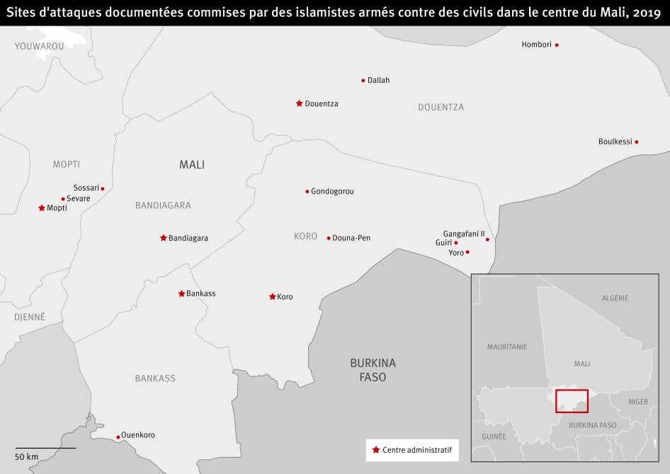Des groupes armés ont tué des centaines de civils dans le centre du Mali en 2019, ce qui en fait l’année la plus meurtrière pour les civils depuis l’éruption, en 2012, de la crise politique et militaire dans ce pays. L’épicentre de la violence se situe dans le centre du Mali, notamment dans la région de Mopti. Des islamistes armés et des groupes d’autodéfense à caractère ethnique ont massacré des gens dans leurs villages, les ont abattus alors que ceux-ci fuyaient et ont exécuté des hommes après les avoir séparés des autres passagers de véhicules de transport publics en raison de leur appartenance ethnique. De nombreux habitants qui n’ont pas pu échapper aux attaques armées ont été brûlés vifs chez eux, tandis que d’autres ont été tués par des explosifs.