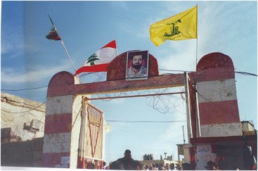 مدخل سجن الخيام .وقد ارتفع فوقه علم حزب الله والعلم اللبناني .