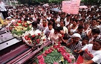 Sepelios colectivos por las víctimas de masacres en la ciudad de Barrancabermeja en 1998. Estos eventos se han vuelto comunes en Colombia. © Agencia Toma