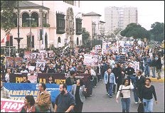 En las inmediaciones del edificio del Congreso, Lima era una ciudad asediada. La Marcha de los Cuatro Suyos, con un nombre inspirado por los cuatro puntos cardinales del imperio inca y organizada por el líder de la oposición Alejandro Toledo como una protesta popular masiva contra la reelección de Fujimori, había llegado a Lima dos días antes. Estaba previsto que la protesta fuera masiva y pacífica. Sin embargo, al ver que los cordones policiales les impedían llegar a sus destinos (el edificio del Congreso y el Palacio Presidencial), algunos manifestantes recurrieron a la violencia. Pequeños grupos de manifestantes blandiendo palos y lanzando piedras se dedicaron a saquear el centro de la ciudad y la policía respondió de manera indiscriminada con cañones de agua y gases lacrimógenos. Las escaramuzas continuaron durante todo el día y se prolongaron hasta la noche. Alrededor de las 10:30 a.m. del día 28, los vándalos prendieron fuego al antiguo Ministerio de Educación (que alberga ahora los tribunales civiles). A mediodía, tres aviones MIG de la Fuerza Aérea peruana sobrevolaron a poca altura mientras los jóvenes violentos rompían las ventanas del Palacio de Justicia y lanzaban dentro trapos impregnados con gasolina, lo que provocó el inicio de fuegos en la planta baja y los pisos superiores. Dos horas más tarde, les tocó el turno a la sede del Jurado Nacional Electoral y al edificio adyacente del Banco Nacional. Seis guardias de seguridad murieron asfixiados por el fuego en el Banco Nacional, que acabó totalmente destruido. Los bomberos y varios periodistas fueron atacados y golpeados. Al menos 80 personas resultaron heridas, muchos de ellos por el impacto en la cabeza o el cuerpo de canastas de gases lacrimógenos. La Policía Nacional informó que había detenido a 106 personas, pero el número real doblaba esta cifra.