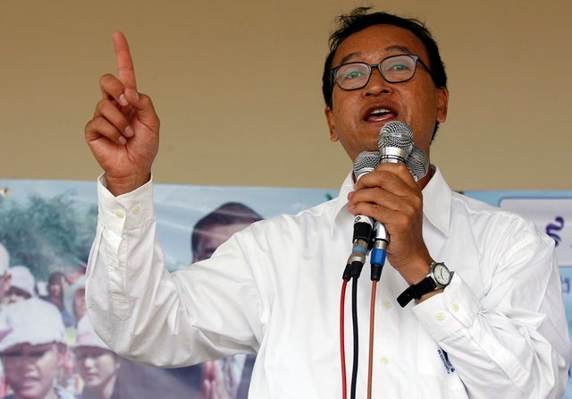 Sam Rainsy, leader of Cambodia's opposition Sam Rainsy Party, speaks during a campaign rally in Kandal province.