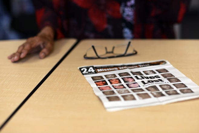 A woman shows a paper she has kept displaying the photos of women, some of whom she knew, who disappeared from the downtown eastside of Vancouver, British Columbia, in the 1990s. July 2012.