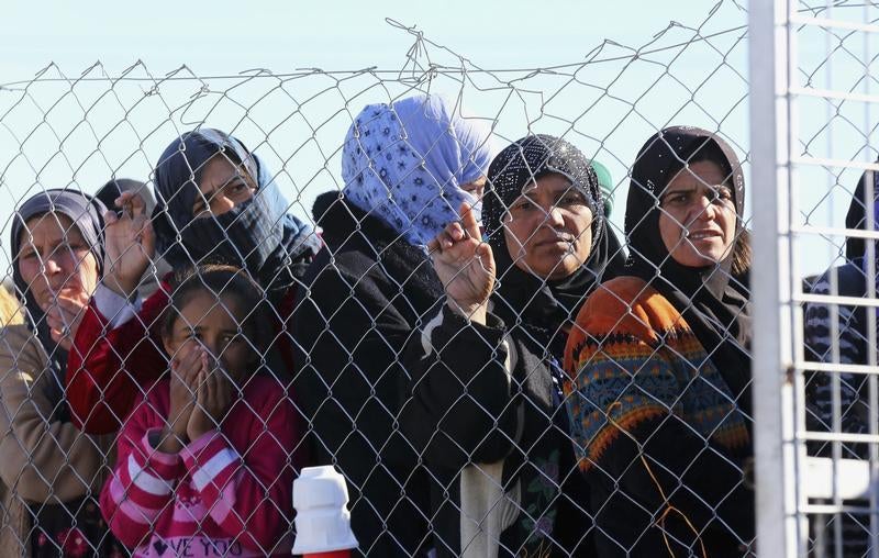 Syrian refugees stand in line as they receive humanitarian aid in Darashakran refugee camp, on the outskirts of Arbil in Iraq Kurdistan region on December 28, 2013.