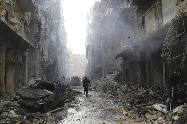 People inspect damage at a site hit by what activists said were barrel bombs dropped by forces loyal to President Bashar al-Assad in Aleppo on March 7, 2014.