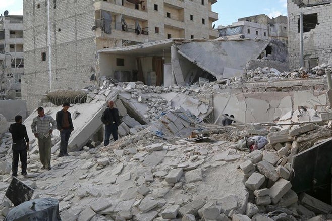 Civilians inspect a site hit by what activists said were barrel bombs dropped by forces loyal to Syria's President Bashar al-Assad in Aleppo on March 26, 2014.