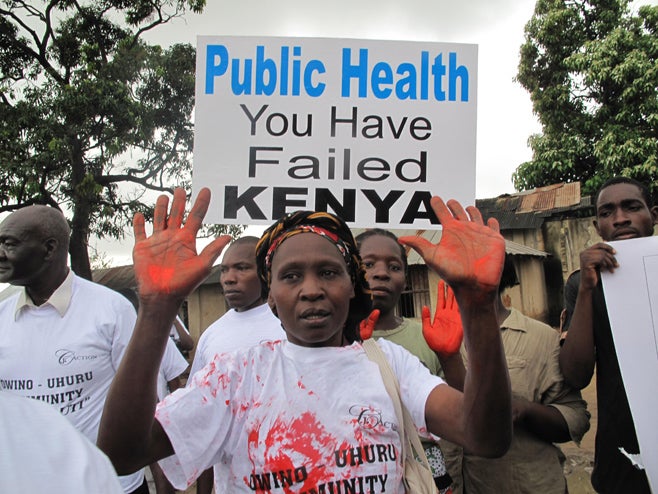 Residents of Owino Uhuru settlement, near Mombasa, Kenya, protest against a lead smelter that opened next to the settlement that killed workers, poisoning residents, and polluted the community, in November 2013.