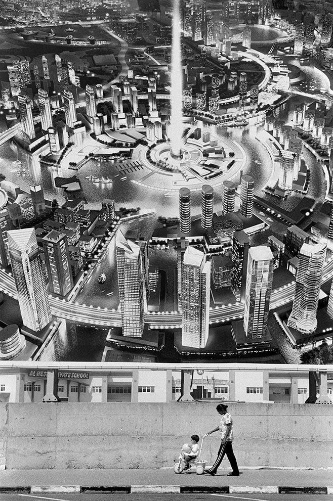 A foreign domestic worker with a child under a billboard in the United Arab Emirates.