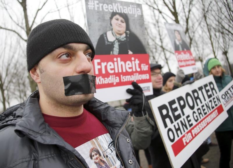 Members of Journalists Without Borders protest against Azerbaijan's President Ilham Aliyev during his visit to meet German Chancellor Angela Merkel, in front of the Chancellery in Berlin, January 21, 2015.