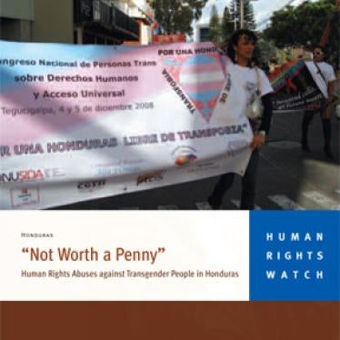 The 45-page report, "‘Not Worth a Penny': Human Rights Abuses against Transgender People in Honduras," details abuses based on gender identity and expression, including rape, beatings, extortion, and arbitrary detentions by law enforcement officials. It also documents police inaction and recurrent failure to investigate violence against transgender people. At least 17 travestis (as many transgender people are called) have been killed in public places in Honduras since 2004. None of these killings have led to a prosecution or conviction.
