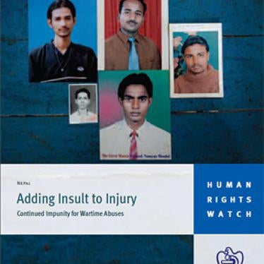 The 49-page report, “Adding Insult to Injury: Continued Impunity for Wartime Abuses” calls for the government to stand by its public commitments and international treaty obligations to conduct credible investigations and prosecute those responsible for abuses. The report follows three previous joint reports by Human Rights Watch and Advocacy Forum on impunity in Nepal and provides a detailed look at six emblematic cases of killings, disappearances, and torture. A separate appendix provides an update on the lack of progress in 62 wartime cases pending before the courts.