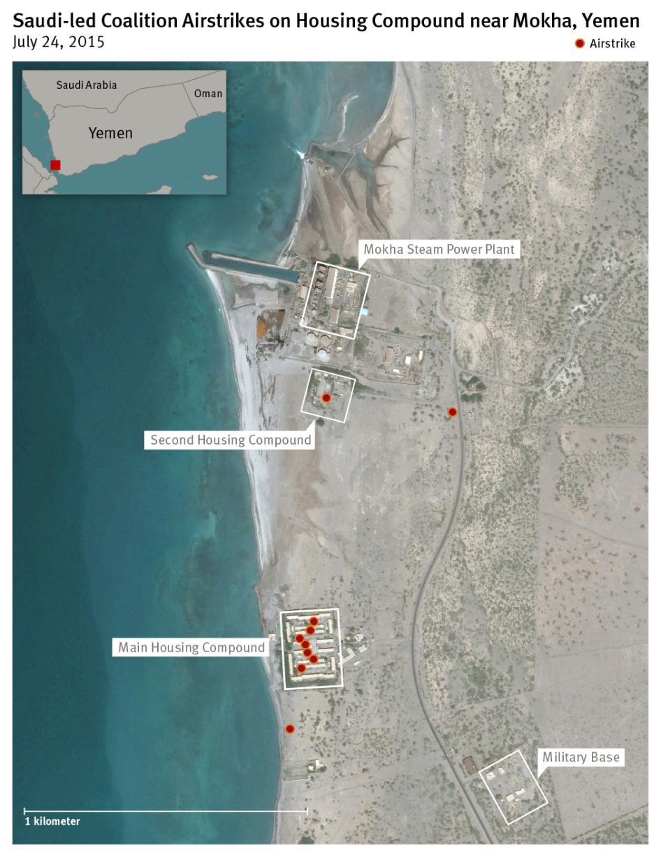 (Sanaa) – Saudi-led coalition airstrikes that killed at least 65 civilians, including 10 children, and wounded dozens in the Yemeni port city of Mokha on July 24, 2015, are an apparent war crime. Starting between 9:30 and 10 p.m., coalition airplanes repeatedly struck two residential compounds of the Mokha Steam Power Plant, which housed plant workers and their family members.