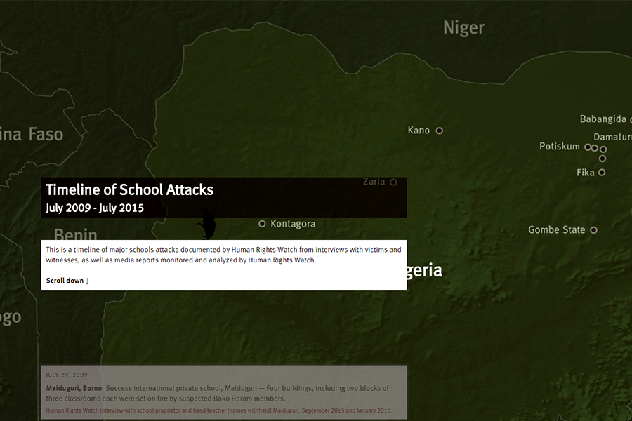 The 86-page report, “‘They Set the Classrooms on Fire’: Attacks on Education in Northeast Nigeria,” documents Boko Haram’s increasingly brutal assaults on schools, students, and teachers since 2009 in Borno, Yobe, and Kano states. Between 2009 and 2015, Boko Haram’s attacks destroyed more than 910 schools and forced at least 1,500 more to close. At least 611 teachers have been deliberately killed and another 19,000 forced to flee. The group has abducted more than 2,000 civilians, many of them women and girls, including large groups of students.