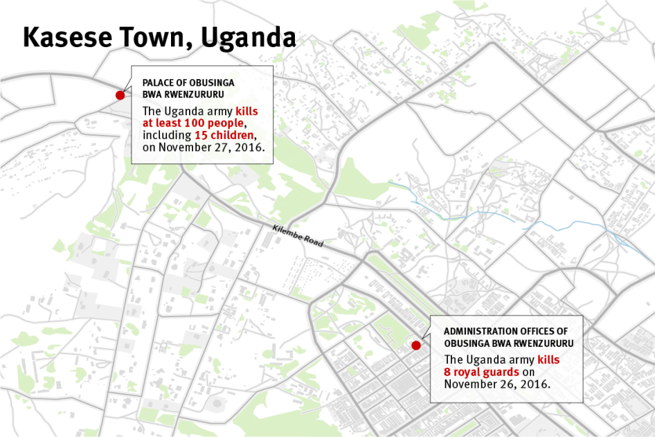 The violence began on the morning of November 26 in Kasese, where there has been longstanding tension between a local cultural kingdom and the central government. Soldiers, under the command of then-Brig.Peter Elwelu, forced their way into the kingdom’s administration offices in Kasese town. The soldiers killed eight members of the volunteer royal guards, who traditionally safeguard cultural sites. Many often carry agricultural tools, such as machetes, but are not formally armed by the kingdom or the government, and would not constitute an armed force or group under international humanitarian law.