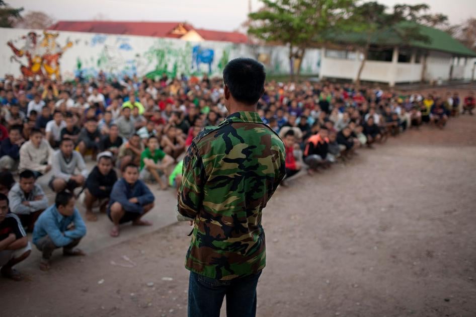 Human Rights Watch found that detainees at the Somsanga center are locked in cells inside barbed wire compounds. Former detainees told Human Rights Watch that they were held for periods of three months to more than a year. Police who guard the facility’s main gate are responsible for security and are a constant presence among detainees. Detainees live in a punitive and heavily controlled environment. Those who try to escape are sometimes brutally beaten by “room captains”—trusted detainees whom police and center staff designate to play a central role in the daily control of other detainees, including serving the center’s as adjunct guards and punishing detainees who infringe center rules. One former detainee told Human Rights Watch that “room captains” beat detainees who had attempted escape “until they were unconscious.” The detainee stated that guards witnessed the beatings and encouraged the “room captains.” Former detainees also reported being punished by being tied up in the sun for hours without food or water.