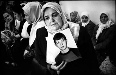 Photo: A woman holds a photo of her missing son as Bosnian Muslim relatives of the victims and survivors of the Srebrenica massacre meet with Dutch former peacekeeping troops. © 2007 Reuters