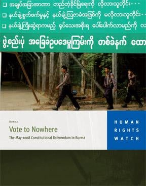 This 61-page report shows that the May 10 referendum in Burma is being carried out in an environment of severe restrictions on access to information, repressive media restrictions, an almost total ban on freedom of expression, assembly, and association, and the continuing widespread detention of political activists. It highlights recent government arrests, harassment and attacks on activists opposed to the draft constitution.