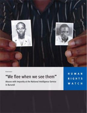 This 33-page report, “‘We flee when we see them’: Abuses with Impunity by the Burundi National Intelligence Service,” documents five incidents of extrajudicial executions, as well as instances of torture and arbitrary detention. Some detainees were beaten with batons until they lost consciousness.