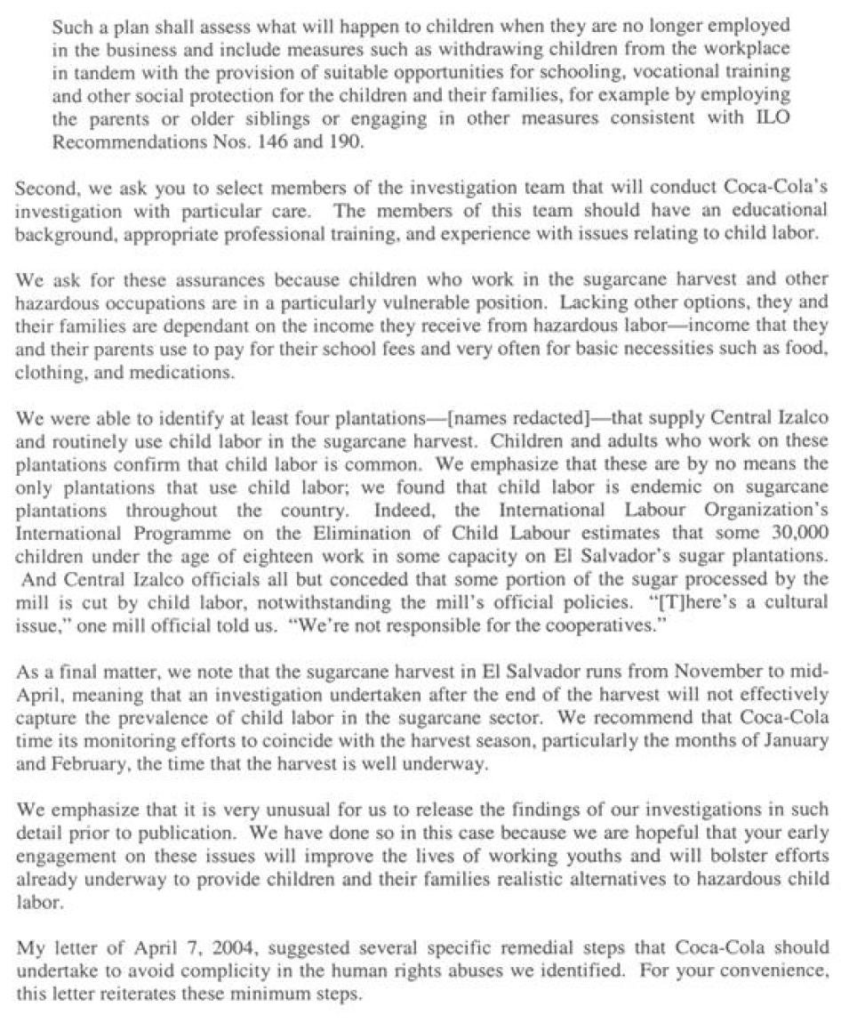- Coca-Cola and other businesses that purchase refined sugar for use in their products should adopt effective monitoring systems to verify that labor conditions on their supplier sugarcane plantations comply with international standards and relevant national labor laws.In cases where plantations fall short of such standards, Coca-Cola and other businesses should assist their supplier mills in providing the economic and technical assistance necessary to bring plantations into compliance.In particular, Coca-Cola and other businesses should support programs and services that offer children and their families alternatives to child labor, publicly reporting the status of such efforts at least on an annual basis.