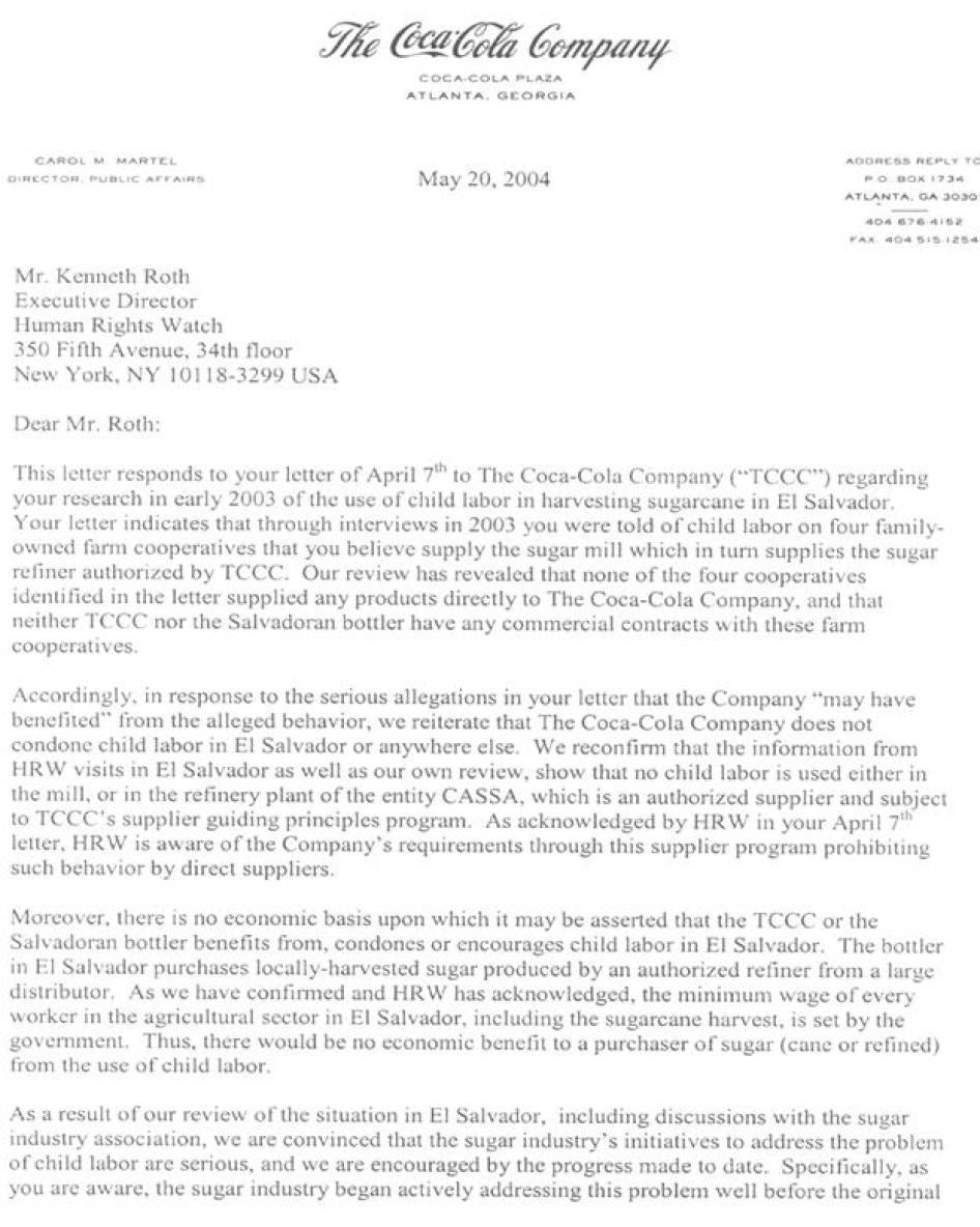 [228] See "Following the Supply Chain:The Link Between Child Labor and the Coca-Cola Company" section, below.Human Rights Watch wrote to Coca-Cola and all of the local employers named in this report, receiving responses from Coca-Cola and and its local supplier.