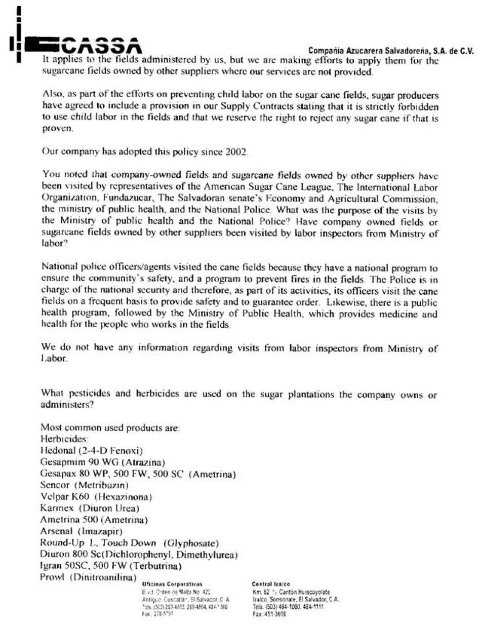 [243] Letter from Michael Bochenek, counsel, Children's Rights Division, Human Rights Watch, to Ingenio San Francisco, January 21, 2004 (DHL Air Waybill No. 7845587805; received January 27, 2004, by Juan Reyes); Letter from Michael Bochenek, counsel, Children's Rights Division, Human Rights Watch, to Ingenio La Cabaa, S.A. de C.V., January 21, 2004 (DHL Air Waybill No. 7845587816; received 11:40 a.m., January 26, 2004, by Doris); Letter from Michael Bochenek, counsel, Children's Rights Division, Human Rights Watch, to Compaa Azucarera Salvadorea, S.A. de C.V., October 14, 2003 (registered article No. RA 832981195US, postmarked Richmond, Vermont, October 15, 2003; return receipt signed and postmarked Nueva San Salvador, La Libertad, El Salvador, October 27, 2003); Letter from Juan Eduardo Interiano, general manager, Compaa Azucarera Salvadorea, S.A. de C.V., to Michael Bochenek, counsel, Children's Rights Division, Human Rights Watch, November 12, 2003; Letter from Michael Bochenek, counsel, Children's Rights Division, Human Rights Watch, to Juan Eduardo Interiano, general manager, Compaa Azucarera Salvadorea, S.A. de C.V., December 4, 2003 (registered article no. RA 111950168US, postmarked Crown Point, New York, December 8, 2003; no return receipt received); Letter from Michael Bochenek, counsel, Children's Rights Division, Human Rights Watch, to Juan Eduardo Interiano, general manager, Compaa Azucarera Salvadorea, S.A. de C.V., March 17, 2004 (DHL Air Waybill No. 7845587293; received March 22, 2004, 3:39 p.m., by Maria); Letter from Michael Bochenek, counsel, Children's Rights Division, Human Rights Watch, to Juan Eduardo Interiano, general manager, Compaa Azucarera Salvadorea, S.A. de C.V., May 6, 2004 (DHL Air Waybill No. 7845586976; received May 10, 2004, 3:49 p.m., by Maria; Letter from Juan Eduardo Interiano, general manager, Compaa Azucarera Salvadorea, S.A. de C.V., to Michael Bochenek, counsel, Children's Rights Division, Human Rights Watch, dated April 30, 2004, and faxed to Human Rights Watch on May 20, 2004.